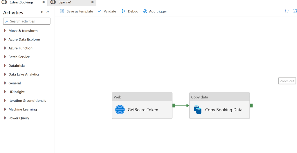 - Copy Activity – This will take the Graph API Bookings endpoint as a source, and copy it into our Data Lake as a sink