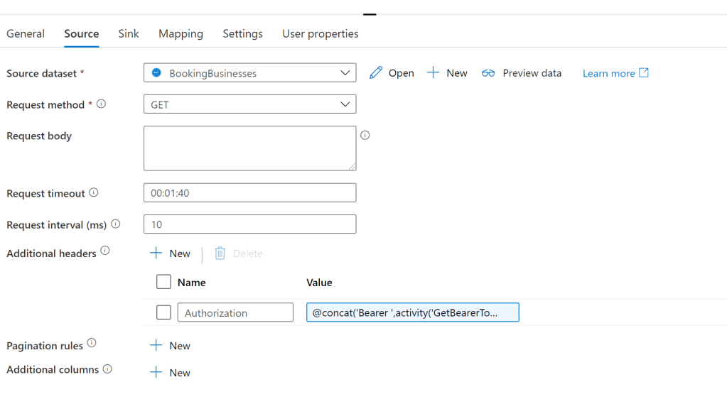 Note, you need to add an additional header of Name = “Authorization” and a Value of “@concat(‘Bearer ‘,activity(‘GetBearerToken’).output.access_token)”, where the activity is the name of the activity that obtained the bearer token.