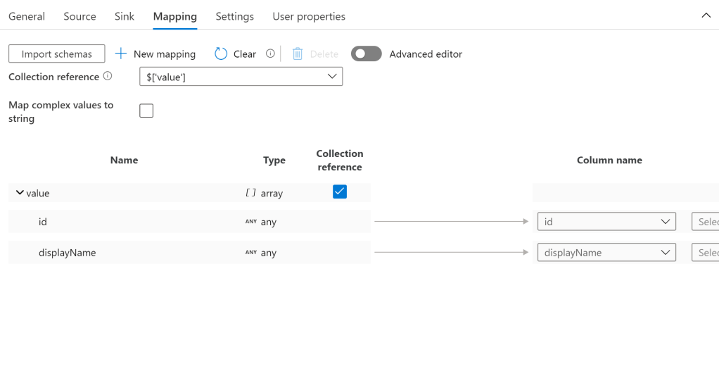 When I first started creating this demo I thought I’d have to something within Mapping Data Flows to transform the JSON but fortunately the Mapping editor in native Data Factory has enough functionality to map the JSON source. For this particular endpoint I set a collection reference for the ‘Value’ array and checked the Collection reference due to the structure of the JSON payload.