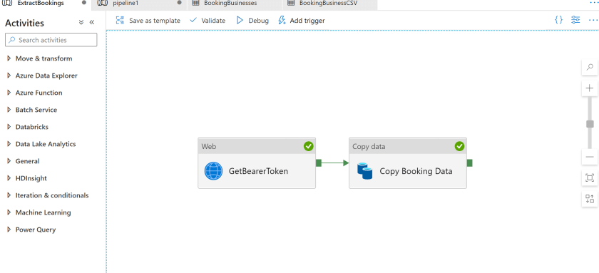 - Copy Activity – This will take the Graph API Bookings endpoint as a source, and copy it into our Data Lake as a sink