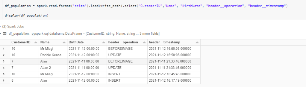 Reading the newly populated delta table we can see we’re capturing all our changes as they ingest into the data lake –