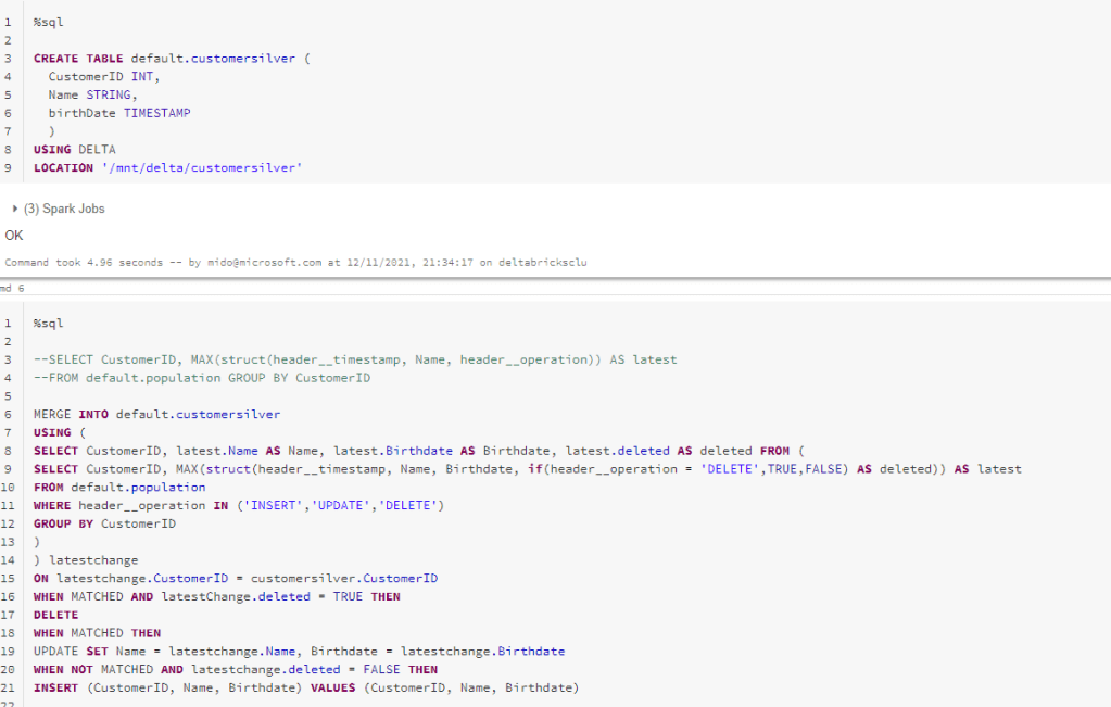 Thus, the second phase of this process then uses a SQL Merge statement (this can also be done in languages like Python if needed) with a MAX function to work out the net changes by row, and then merge them into the target Silver delta table (see Medallion architecture pattern). We create a delta table based on our CDC data –