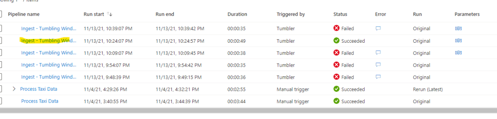 The tumbling window now runs on a schedule as above, as new files land in the data lake they’re picked up in a given window, and processed by the copy activity to a downstream Synapse staging table –