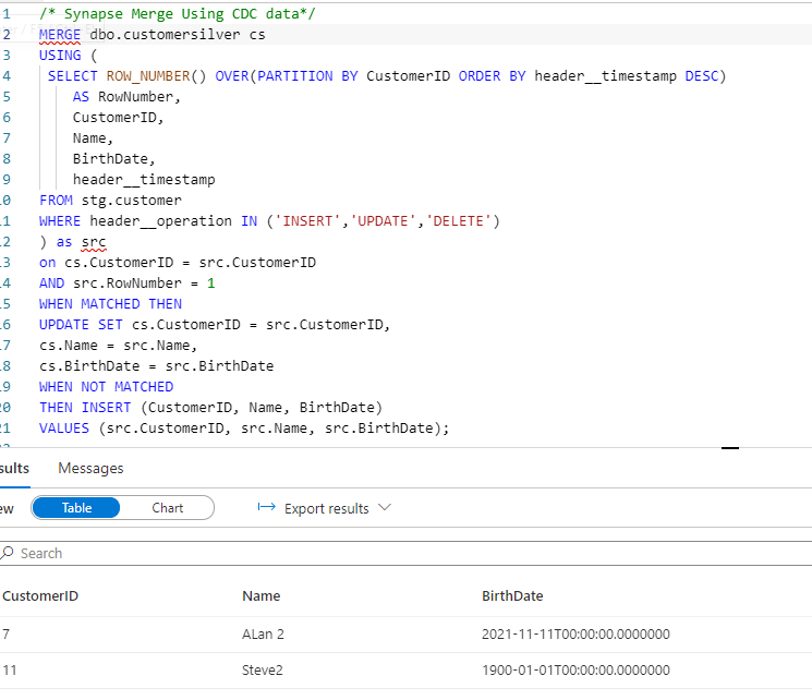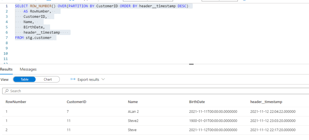 In the above I’m using the ROW_NUMBER function in Synapse pool to identify the latest row per CustomerID. For the record, window functions like this are some of my favourite in the entire SQL ecosystem, combined with MERGE :-). The function gives us the RowNumber output which can be used to select a specific member of the window based on other columns. In this case we partition by CustomerID (so it creates a “window” per CustomerID) and order by header__timestamp (so we can identify the latest version of the row). We add a filter on RowNumber to only return the most recent version of the row.